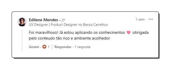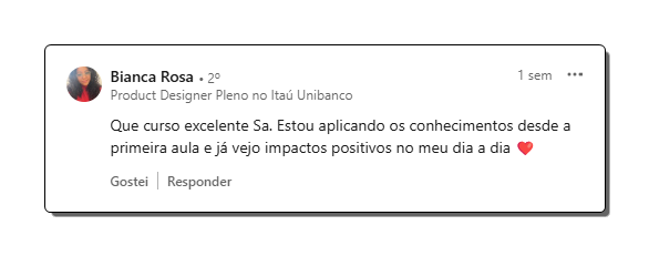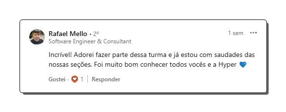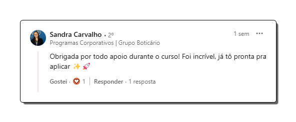 "Aulas muito didáticas, com exercícios práticos e coesos. Reflexões e desafios ajudaram muito a fixar o conteúdo e refletir sobre os próximos passos."