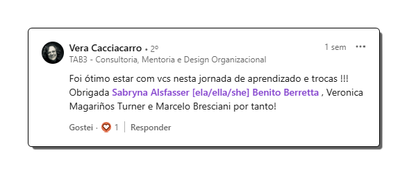 "Eu entrei achando que eu sabia monte sobre comunicação [...] Porém, eu sai com a minha caixinha de ferramentas ainda mais cheia, ainda mais robusta, e a cabeça cheia de desafios para ser mais intencional, para prestar mais atenção, e para ser mais estratégica na minha comunicação também." ▶️ Assista ao Depoimento Completo